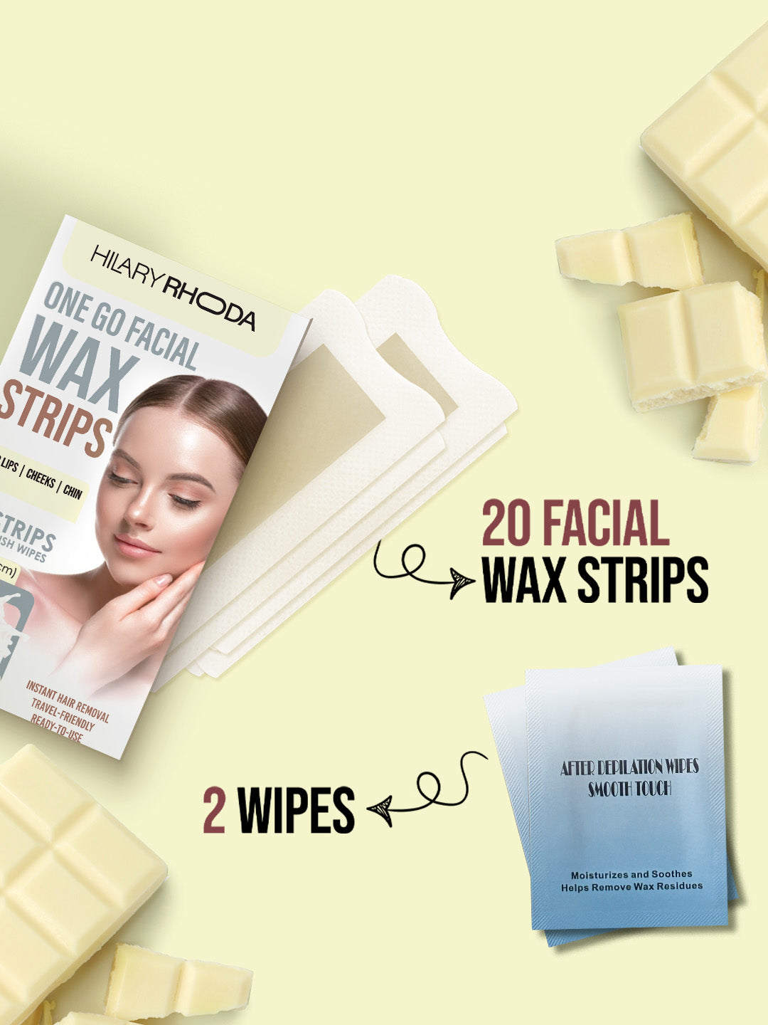 One Go Facial Wax Strips by Hilary Rhoda is your one-stop solution to that stubborn facial hair that ruins your look. The facial wax strips are specially designed to be gentle on the skin and focus on removing hair from the root. Our cold gel formula saves your skin from burns. One Go Facial Wax Strips is a convenient & comfortable alternative for users who wish to remove unwanted facial hair. It saves you money because One Go Facial Wax Strips are at least 2x cheaper than a trip to the salon. The pack contains 20 wax strips and 2 free wipes that are ideal for removing hair from your face gently. Our formula is made with natural extracts and comes in 3 variants — avocado oil, chamomile and lavender to give you an irritant-free experience. Just peel, press, and pull! No mess, no fuss, no hassle — enjoy a radiant glow with One Go Facial Wax Strips.