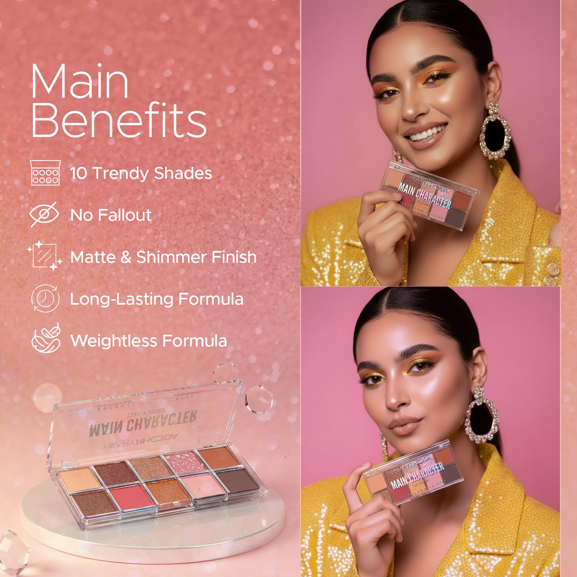 Unlock your star potential with the Hilary Rhoda Main Character Eyeshadow Palette, your essential eyeshadow set for flawless looks. This ultimate makeup palette features intensely rich pigmented eyeshadow with a diverse colour palette of velvety matte eyeshadow and brilliant shimmer eyeshadow. The lightweight eyeshadow formula is designed for smooth, effortless blending and incredibly long-lasting wear without any heavy feeling. Get ready for zero creasing, zero fading, and zero fallout — just pure, high-impact eyeshadow makeup that makes your eyes mesmerise.
